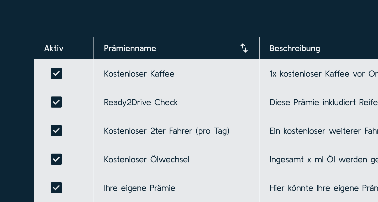 Ob Tankgutscheine, Freikilometer oder VIP-Services – verwalten und analysieren Sie Ihre Prämien-Performance in Echtzeit. Wir zeigen Ihnen, was am besten performt.