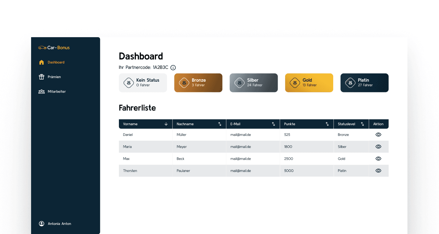 Behalten Sie den Überblick über alle aktiven Fahrer und eingelösten Benefits. Automatisierte Workflows sorgen dafür, dass die Prämienausgabe an Standorten ohne manuellen Aufwand erfolgt.